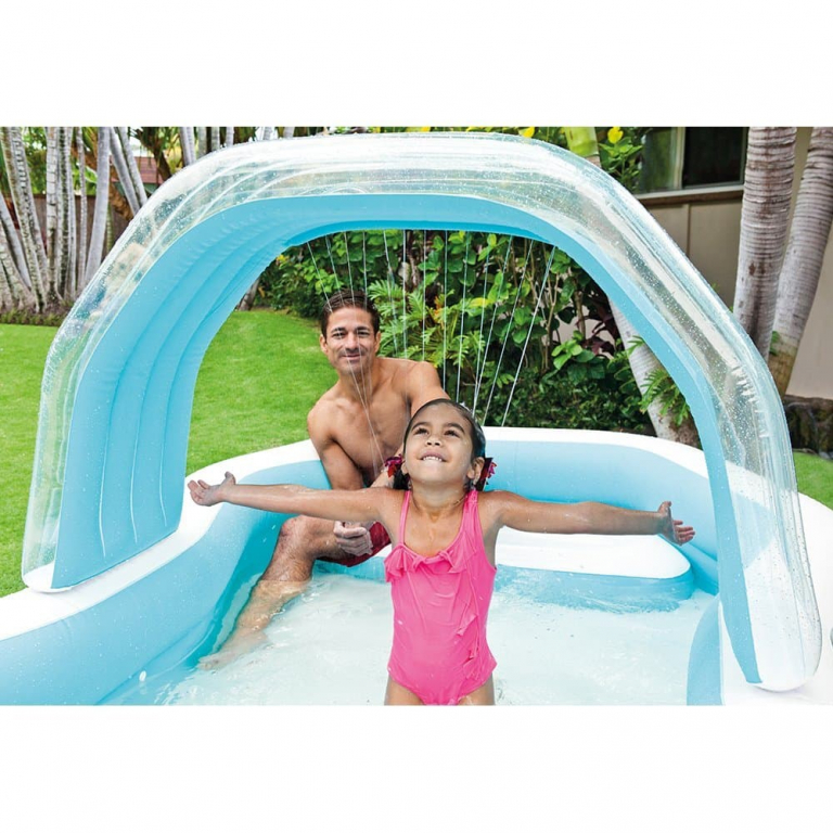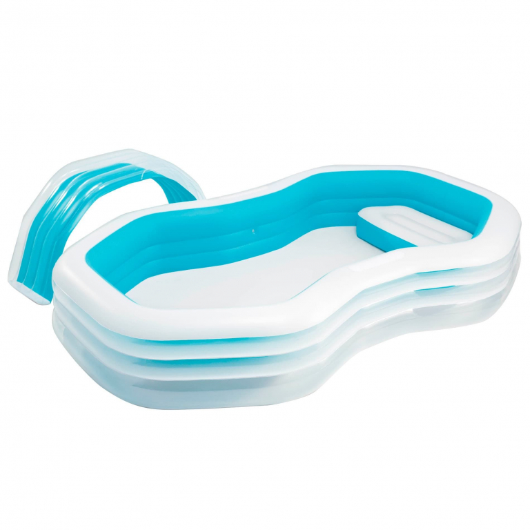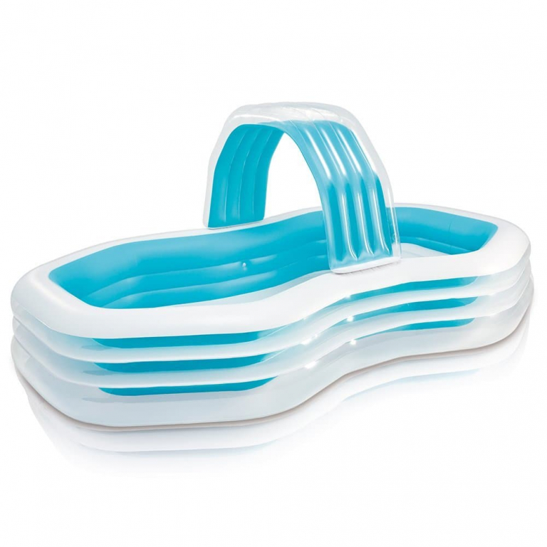 Семейный надувной бассейн Intex арт.57198 с сиденьями - это объемный бассейн, по центру которого находится надувная арка. При подключении садового шланга из арки льется небольшой водопад, охлаждая малышей в жаркую погоду. По краям конструкции надувные подушки-сиденья. Вместимость воды - более 700 литров. Бассейн удобен в использовании и безопасен для детей от 3 лет. Клапан для слива воды находится в дне бассейна. Насос в комплект не входит.